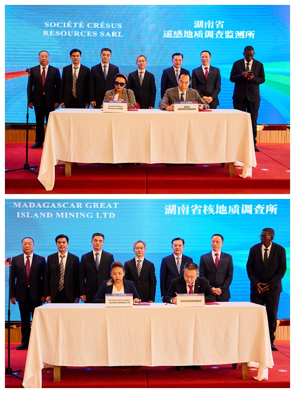 揭牌仪式前还举行了两场签约仪式:湖南省遥感地质调查监测所与马达加斯加Société Crésus Resources SARL(凯旋资源有限公司)签订合作协议,合同金额为1000万美元,省遥感所所长伍新民与马方代表RAZAFINDRANORO Elysah Houssenah代表双方签约。湖南省核地质调查所与马达加斯加MADAGASCAR GREAT ISLAND MINING LTD就“马达加斯加图利亚拉省贝罗罗哈铜矿区详查”项目举行地质勘查项目技术服务合同签约仪式,合同金额1214万元,省核地质所总工程师程云涛与马方总经理Razakaria Hobiniaina代表双方签约。